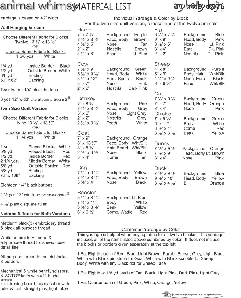Animal Whimsy Quilt download pattern is an 89 page PDF pattern you print on your home printer. Be sure "actual size" is checked in the print box when printing. Animal Whimsy Quilt download pattern includes instructions with photos, full size patterns, and placement sheets to make both a 42" x 54" Wallhanging quilt with twelve animal blocks and a 60 1/2" x 96 1/2" Twin Size Quilt with nine animal blocks and nine pieced shoo-fly blocks. The technique for the animals is fusible applique. The block size is 12 1/2" x 12 1/2"