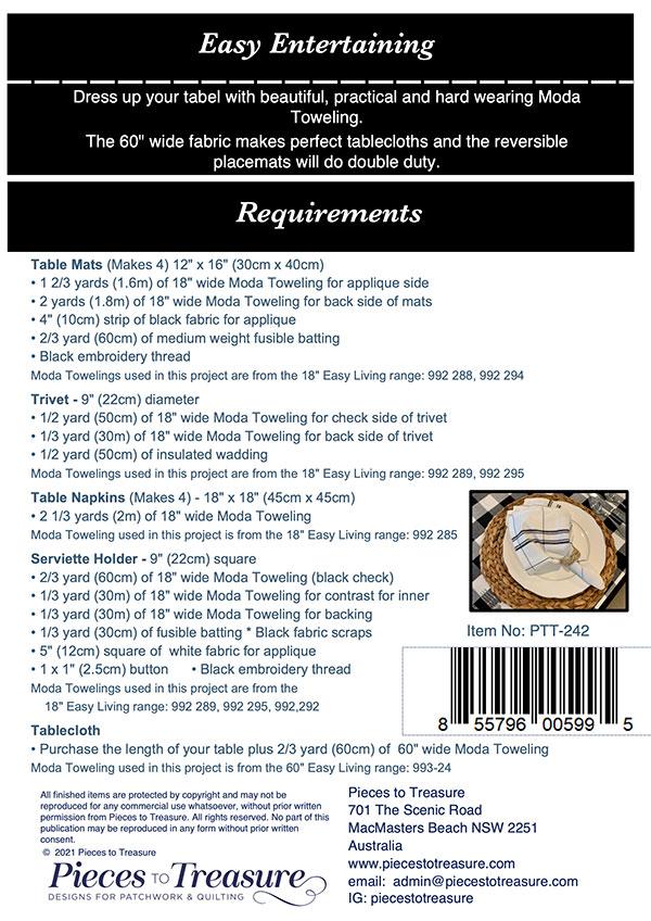 Easy Entertaining Table Set, Napkins, Table Runners, Table Cloth, Place Mats and Trivet made with toweling Pattern, by Pieces to Treasure Uses 18" width toweling.