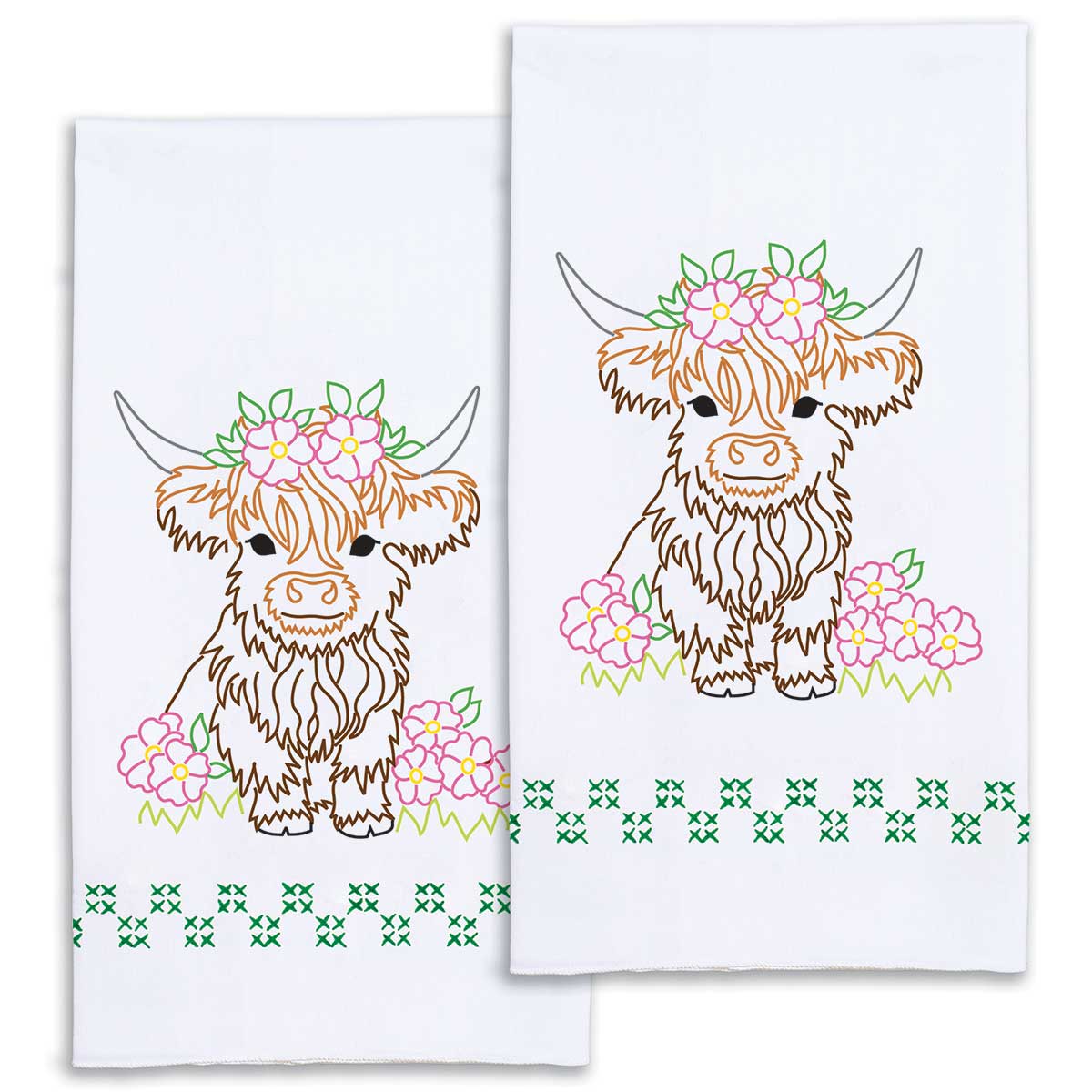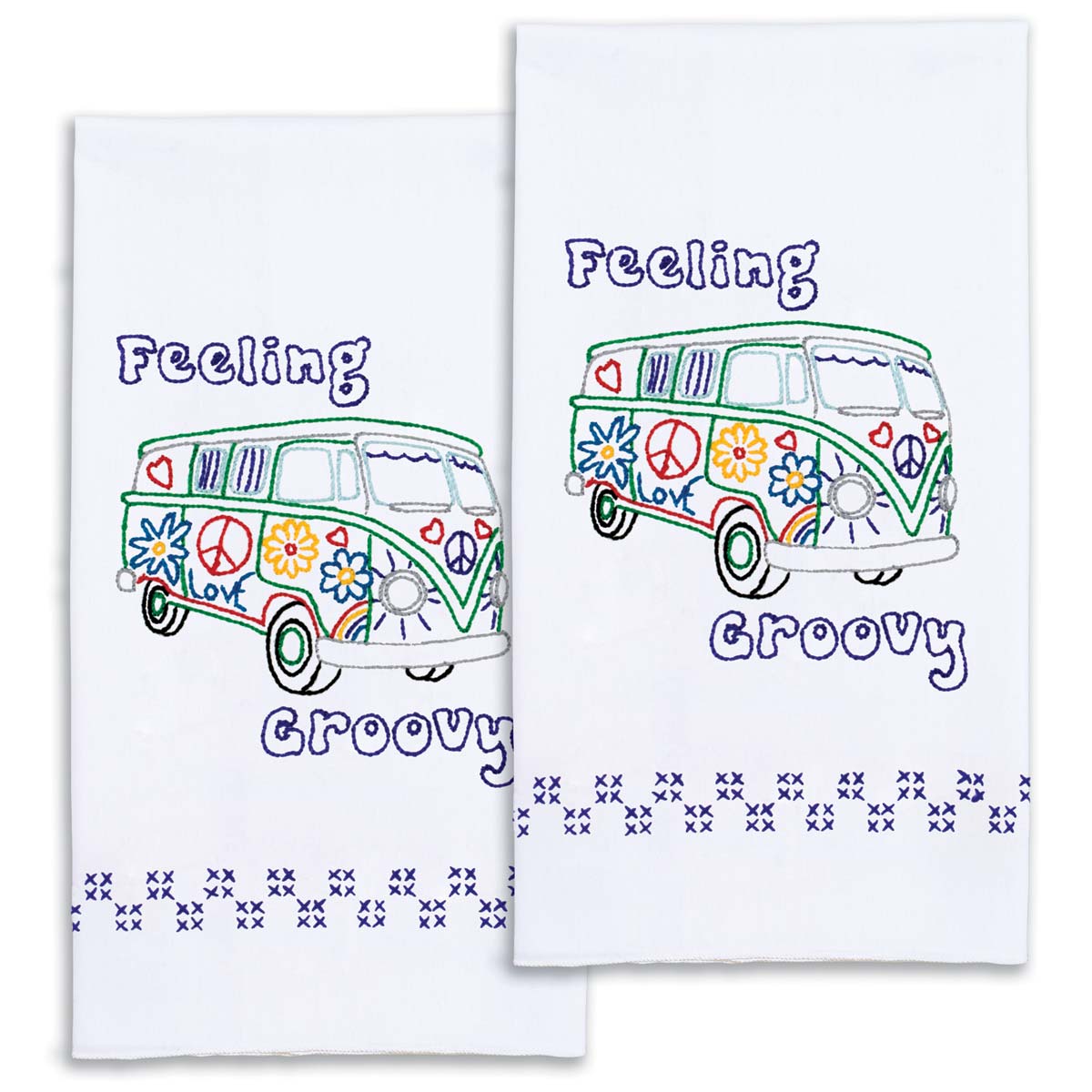 Each package contains a pair of 17″ x 28″ decorative hand towels, and embroidery design guide. Made of poly/cotton broadcloth.