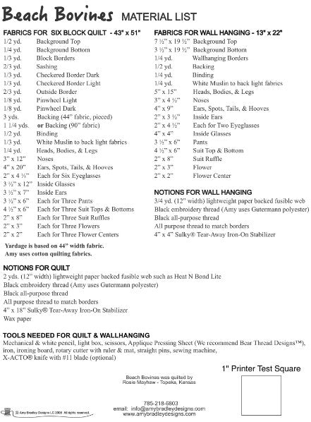 Beach Bovines Download Pattern is a 24 page PDF pattern you print on your home printer. Be sure "actual size" is checked in the print box when printing. Beach Bovines download pattern includes instructions, full size patterns, and placement sheets to make both a 43" x 51" six block quilt and a 13" x 22" two cow wall hanging. The technique for the cows is fusible applique. The block size is 8 1/2 x 10 1/2".