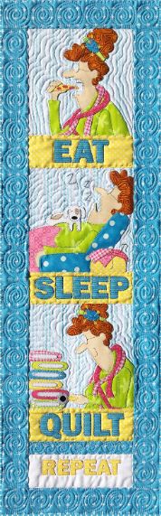 Eat Sleep Quilt pattern includes full size patterns, placement sheets, and instructions to make this 12 1/2" x 39 1/2" wall hanging. The technique is fusible applique.