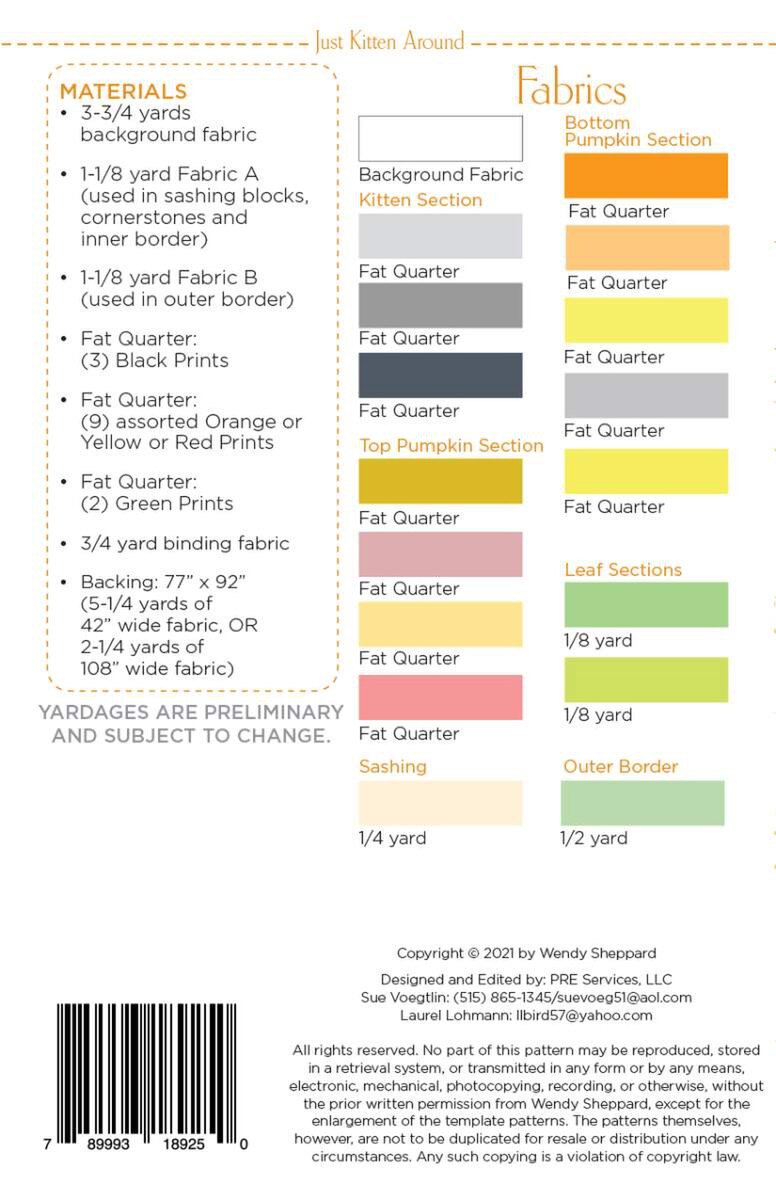 The Just Kitten Around Quilt by Wendy Sheppard is fat quarter friendly and features cats sitting atop pumpkins. Finished size is 39 1/2" x 49 1/2".