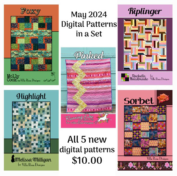 May 2024 PDF Digital Quilt Pattern Collection by Villa Rosa Designs, including Foxy, Highlight, Pinked, Riplinger, Sorbet