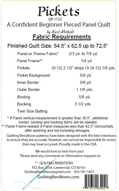 This wonderful panel is highlighted by "Pickets". Most sizes of horizontal panels will work with this fun pattern. You can use your stash for the Pickets or coordinate with other fabrics from the line. Enjoy!