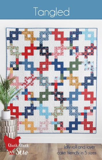 Tangled is a beginner friendly pattern that includes Crib, Throw, Twin, Queen, and King sizes. It can be made with pre-cut 2 1/2" strips, or pre-cut 10" squares, or yardage. The Throw size can be made with one Jelly Roll or Layer Cake.